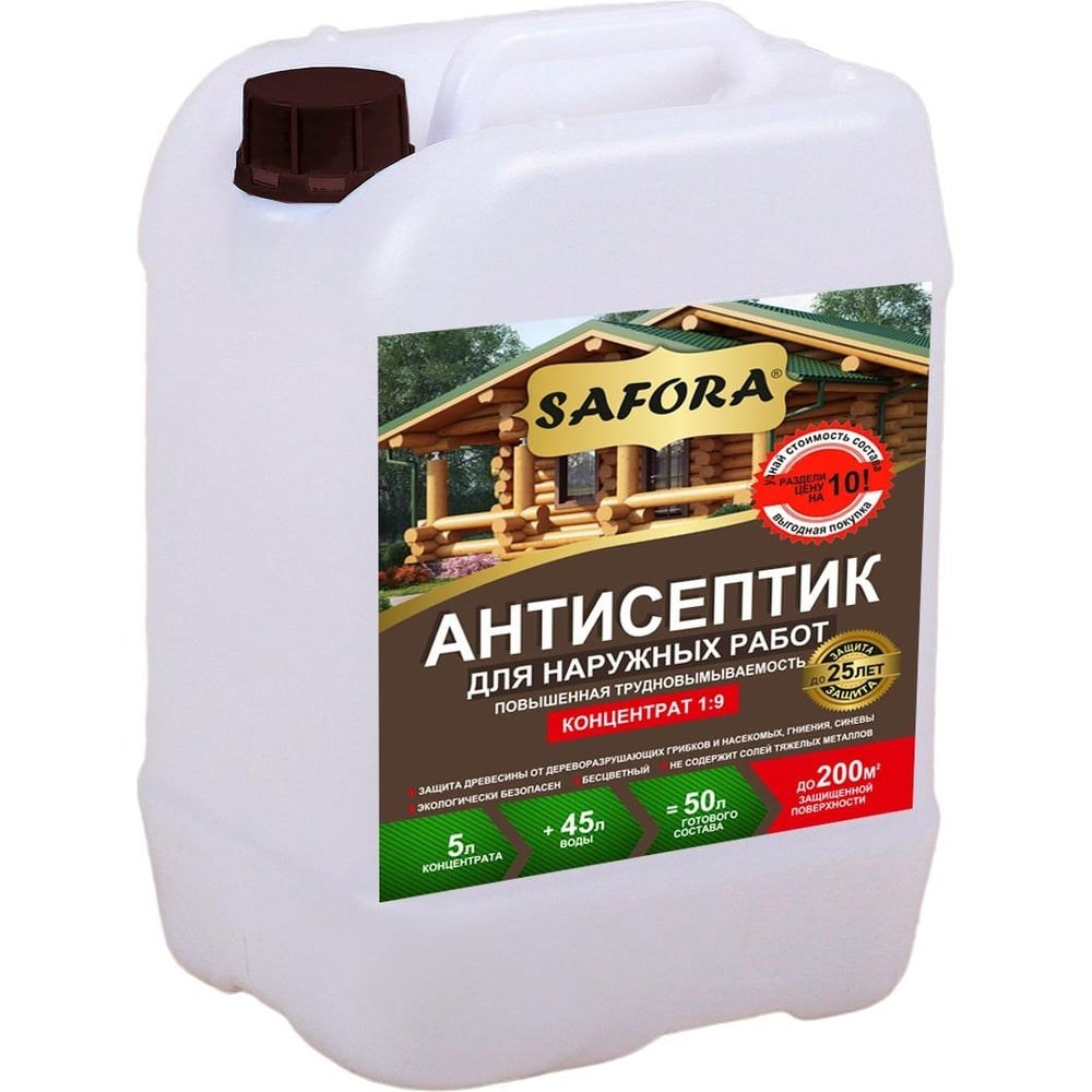 Антисептик для дерева, для фасадных и внутренних работ SAFORA (концентрат 1:9; 5 литров) АН05 предназначен для защиты древесины внутри помещений и под навесом, включая пол и другие поверхности. Свойства: Обеспечивает высокую защиту древесины на срок до 25 лет от гниения, от дереворазрушающих и деревоокрашивающих плесневелых грибов, разрушения древесины насекомыми-древоточцами. Не изменяет цвет и структуру древесины, не препятствует дальнейшей обработке, склеиванию и окраске, быстро фиксируется в древесине. Покрытие не образует защитную пленку на поверхности, а пропитывает ее. Концентрация продукта в растворе: при нанесении кистью, распылением минимальная концентрация продукта в водном растворе составляет 1:9. Приготовление раствора 1:9- 1л продукта растворить в 9л воды, 5л на 45л воды. Продукт непосредственно после пропитки может легко вымываться из древесины. Обработанную древесину следует защитить от влаги до высыхания. Расход: 100-250 г/кв.м.