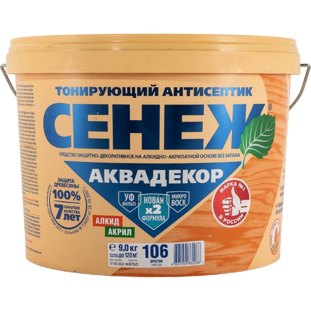 Антисептик для дерева СЕНЕЖ АКВАДЕКОР Х2-106 орегон, 9 кг 11051 предназначен для долговременной защиты древесины от атмосферных осадков, плесневых, деревоокрашивающих и дереворазрушающих грибов, водорослей и насекомых-древоточцев, а также декоративной отделки под ценные породы. Готовый к применению водоразбавляемый состав на алкидно-акрилатной основе с добавлением льняного масла отлично проникает в древесину, формирует эластичное дышащее защитное покрытие с мягким шелковистым блеском. Материал используют для наружных и внутренних работ (окрашивание стен, обшивок, перегородок, фронтонов, дверей, оград, садовой мебели, фанеры, шпона, ДСП и ДВП, а также других пиленых, строганных, рубленых деревянных поверхностей). Допускается обработка антисептиком полов, перил, террас с последующим покрытием устойчивым к истиранию лаком. Способ применения: Продукт перед использованием тщательно перемешать и наносить на очищенную от грязи, пыли, старых покрытий древесину кистью, валиком, губкой, безвоздушным распылением в 1-2 слоя (внутренние работы) или 2-3 слоя (наружные работы, влажные или солнечные условия) вдоль волокон с промежуточной сушкой 45-60 минут в сухую облачную погоду при температуре воздуха не ниже +5 градусов. Особо тщательно обрабатывать торцы. Не обрабатывать мерзлую древесину. Время высыхания 1 час (от пыли). Расход для однослойного нанесения для пиленой поверхности 120 - 180 г/кв. м, для строганной поверхности 70 - 90 г/кв. м. Внимание! Окончательный цвет формируется при высыхании.
