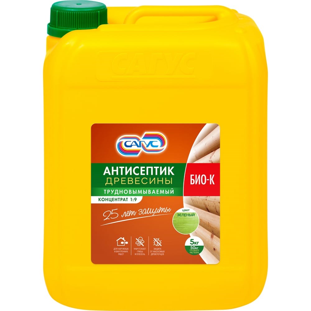 Антисептик древесины предназначен для защиты древесины от гниения, плесени, синевы и профилактики от жуков-древоточцев внутри помещений и на открытом воздухе, в тяжелых условиях эксплуатации, при активном и продолжительном воздействии атмосферной или почвенной влаги, длительном контакте с грунтом, в том числе в условиях влажного климата.Антисептик САГУС Био-К является концентратом и разбавляется водой в пропорции 1:9. Антисептик наносят на древесину кистью, распылителем. Расход не менее 350 г/м2. До ввода пропитанной древесины в эксплуатацию ее необходимо выдержать в течение 3-5 суток в условиях, исключающих увлажнение атмосферными осадками (под навесом, под пленкой и др.). Эта мера необходима для обеспечения фиксации антисептика в древесине, что делает его трудновымываемым. Эффективность антисептической обработки сохраняется в течение 15-25 лет.Область применения:- Фасадные деревянные поверхности стен.- Элементы цокольных перекрытий (прогоны, балки, доски и щиты черного пола, лаги и др.)- Элементы стропильных систем (мауэрлаты, стропильные ноги, подкосы, затяжки, стойки, обрешетка кровли и др.).- Веранды, террасы, перголы, беседки.- Бревенчатые и брусчатые стены.- Дощатые настилы причалов, тротуаров и пешеходных дорожек.- Элементы каркасных стен.- Заборы, столбы, ограды, садовые строения, малые архитектурные формы и др., лежни и настилы по грунту и др. элементы, эксплуатируемые на открытом воздухе или контактирующие с грунтом.
