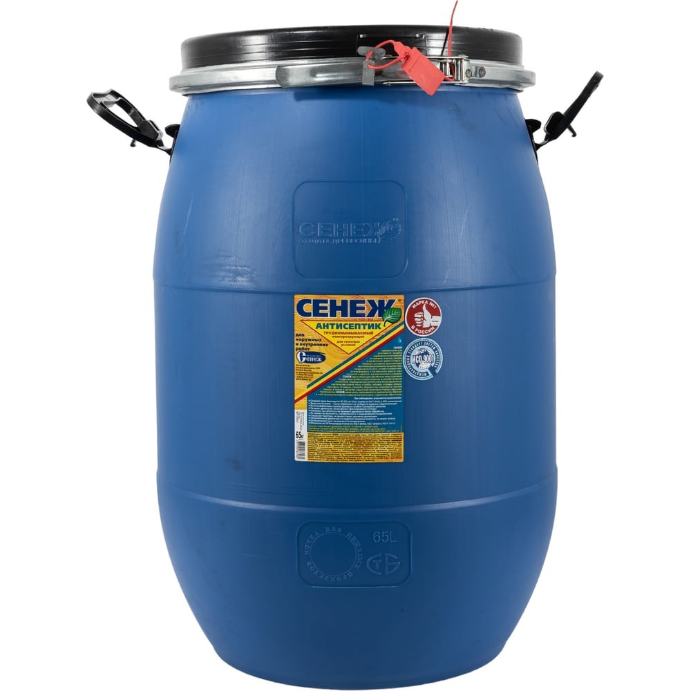 Антисептик СЕНЕЖ бочка Е 65 кг 00000000560 - готовый к применению водный раствор активных целевых неорганических компонентов. Применяют для обработки новых и ранее обработанных антисептиком ответственных труднодоступных деревянных балок, несущих брусьев, перекрытий, лаг, нижних и верхних венцов, настилов по грунту, столбов, заборов и оград, причалов, погребов, теплиц и других пиленых, строганных и рубленых элементов конструкций жилищного, общественного, производственного и сельскохозяйственного назначения, подверженных активному биоразрушению. Внимание! Не применяют по поверхностям, ранее покрытым олифой, краской, лаком, другими пленкообразующими или водоотталкивающими материалами. Расход: При нанесении кистью, валиком, распылителем не менее 250-300 г/кв. м. При вымачивании или автоклавировании 200-240 кг/куб. м. Расход зависит от условий эксплуатации и требуемого срока службы обработанной древесины.