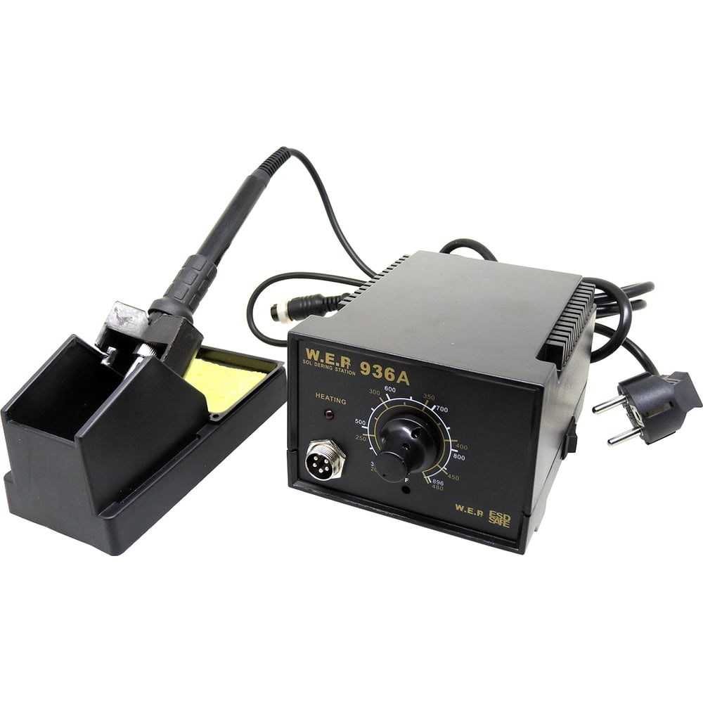 Антистатический паяльник W.E.P 936A 60Вт М0951873 с индикатором нагрева на передней панели. Выходное напряжение: 24В АС. Стабильность температуры: ±2%. Нагревательный элемент с сопротивлением 16-20 Ом, представляет собой нихром, запаянный в керамику. Регулировка температуры в диапазоне от 200 до 480°С.