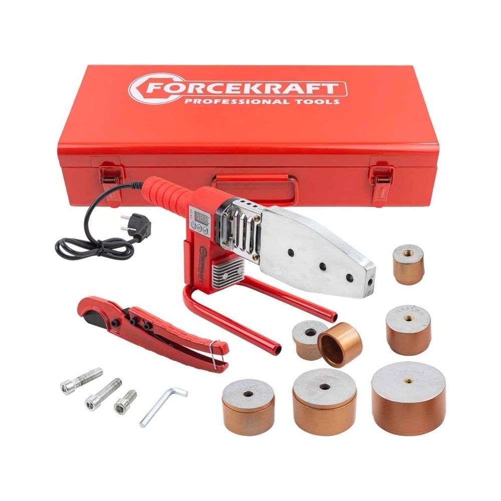 Сварочный аппарат для пластиковых труб от бренда Forcekraft предназначен для монтажа систем водоснабжения, отопления и канализации в частных домах и квартирах. Он подходит для работы с трубами из ПВХ, ПВД, ПНД и полипропилена.Основные характеристики:Тип сварки: Раструбный тип, что гарантирует долговечное соединение расплавленных поверхностей труб и фитингов.Нагреватель: Мечевидная форма нагревателя в сочетании с подходящей насадкой формирует герметичный шов, сохраняя прочность и пластичность материала.Диаметры труб: Работает с трубами диаметром 20, 25, 32, 40, 50 и 63 миллиметра.Температурный диапазон: 0-380 °С.Время нагрева: 4 минуты.Мощность: 1 кВт.Напряжение: 220 В ~50 Гц.Вес аппарата: 2 кг.Дополнительные функции:Индикаторы: Аппарат оснащен индикаторами подключения к сети и контроля температуры.Автоматическое отключение: В случае перегрева аппарат автоматически отключается.Антипригарное покрытие: Тефлоновое покрытие исключает прилипание расплавленного материала к поверхности, что облегчает чистку после работы.Комплектация:Специальная подставка для безопасного размещения паяльника во время работы.Труборез (0-40 мм) для быстрой подготовки труб к сварке.Удобный кейс для хранения и транспортировки аппарата.Преимущества:Сварочный аппарат от Forcekraft обеспечивает надежное и качественное соединение пластиковых труб, что делает его идеальным выбором для профессионалов и домашних мастеров, занимающихся установкой систем водоснабжения и отопления.
