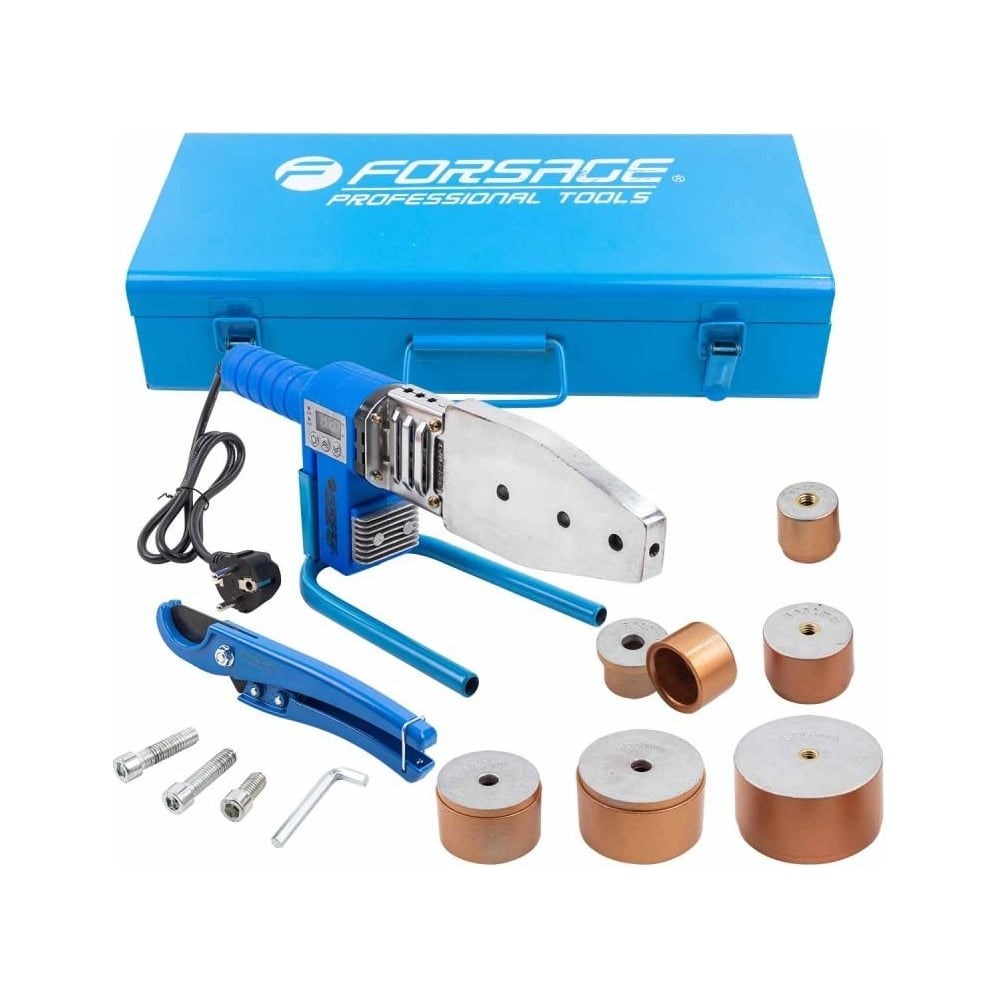Сварочный аппарат для пластиковых труб от бренда Forsage предназначен для монтажа систем водоснабжения, отопления и канализации в частных домах и квартирах. Он подходит для работы с трубами из ПВХ, ПВД, ПНД и полипропилена.Основные характеристики:Форма нагревателя: Мечевидная форма в сочетании с подходящей насадкой обеспечивает формирование герметичного шва, сохраняя прочность и пластичность материала.Метод сварки: Сварка пластиковых труб осуществляется раструбным типом, что гарантирует долговечное соединение расплавленных поверхностей труб и фитингов.Индикаторы: Аппарат оснащен индикаторами подключения к сети и контроля температуры.Автоматическое отключение: В случае перегрева аппарат автоматически отключается для повышения безопасности.Антипригарное покрытие: Тефлоновое покрытие предотвращает прилипание расплавленного материала, что облегчает чистку после работы.Безопасность: В комплекте имеется специальная подставка для размещения паяльника, что обеспечивает дополнительную безопасность во время работы.Дополнительные инструменты: В комплекте с аппаратом идет труборез для труб диаметром 0-40 мм, что позволяет быстро подготовить трубы к сварке.Удобство хранения: Аппарат поставляется в кейсе, что обеспечивает удобное хранение и транспортировку.Технические параметры:Диапазон температур: 0-380 °CВремя нагрева: 4 минутыЭтот сварочный аппарат является отличным выбором для профессионалов и любителей, обеспечивая надежное и качественное соединение пластиковых труб.