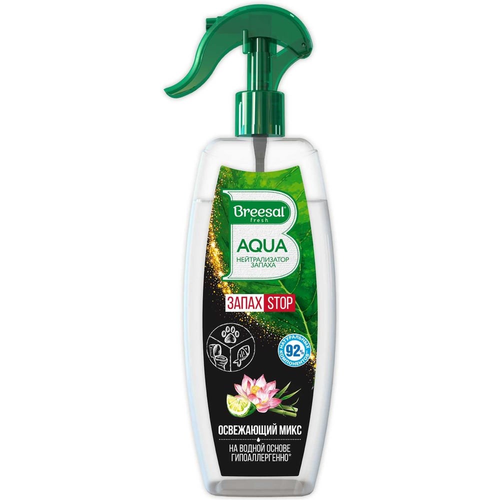 AQUA-нейтрализатор запаха Breesal "Освежающий микс" В/40006 борется со всеми видами неприятных запахов, а не маскирует их. Инновационные компоненты связывают молекулы неприятного запаха. Препятствует размножению бактерий. После работы акванейтрализатора в воздухе остается только легкая композиция из ароматов голубого лотоса, свежего лайма и сочного бамбука. Благодаря инновационному компоненту Acti-Leaf спрей нейтрализует запахи в доме, оставляя только свежесть. Подарите себе и близким уют в доме с акванейтрализатором Breesal «Освежающий микс»! Одобрено аллергологами и Институтом Иммунологии Гипоаллергенная формула, 92% натуральных компонентов