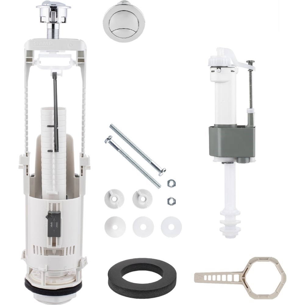 Арматура подходит к унитазам Cersanit, Vitra, Jacob delafon ,Roca, Vitra и др.Клапан спускной BRIO 573 с двойным кнопочным пускомПодходит для бачков различной высоты: высота спускного клапана регулируется от 305 до 457мм.Предназначен для бачков с диаметром отверстия в крышке от 38 до 42мм. (допустимое смещение кнопки +/- 12 мм) и с отверстием в дне бачка диаметром от 60 до 72мм.Регулируемый объем большого и малого спуска воды. Большой спуск регулируется с 6л. до 4л., малый спуск регулируется с 3л. до 2л.Высокопрочная хромированная кнопка устойчивая к истиранию (покрытие нанесено методом гальванизации).Испытан и сертифицирован более чем на 200 000 циклов.Седло (или донный клапан) изготовлено из прочного пластика ABS.Прокладка между спускным клапаном и дном бачка выполнена из литого эластомера СБС. Её эластичность и форма усиливают герметичность донной части бачка.Прокладка между бачком и унитазом изготовлена из пенорезины, позволяет компенсировать неровности полки унитаза.Клапан наполнительный BRIO 755 ½’Наполнительный клапан с нижним подключением ½’, пластиковый штуцерУниверсальный, подходит для всех типов бачковГидравлическое закрытие (без гидравлического удара)Регулируемый уровень набора водыПропускная способность 0,14 л/с под давлением 3 барРабочее давление от 0,5 до 12 бар.Бесшумный NF (класс шума 1)Продукция изготовлена в соответствии с ГОСТ 21485-2016.Монтажный комплект в наборе поставки.