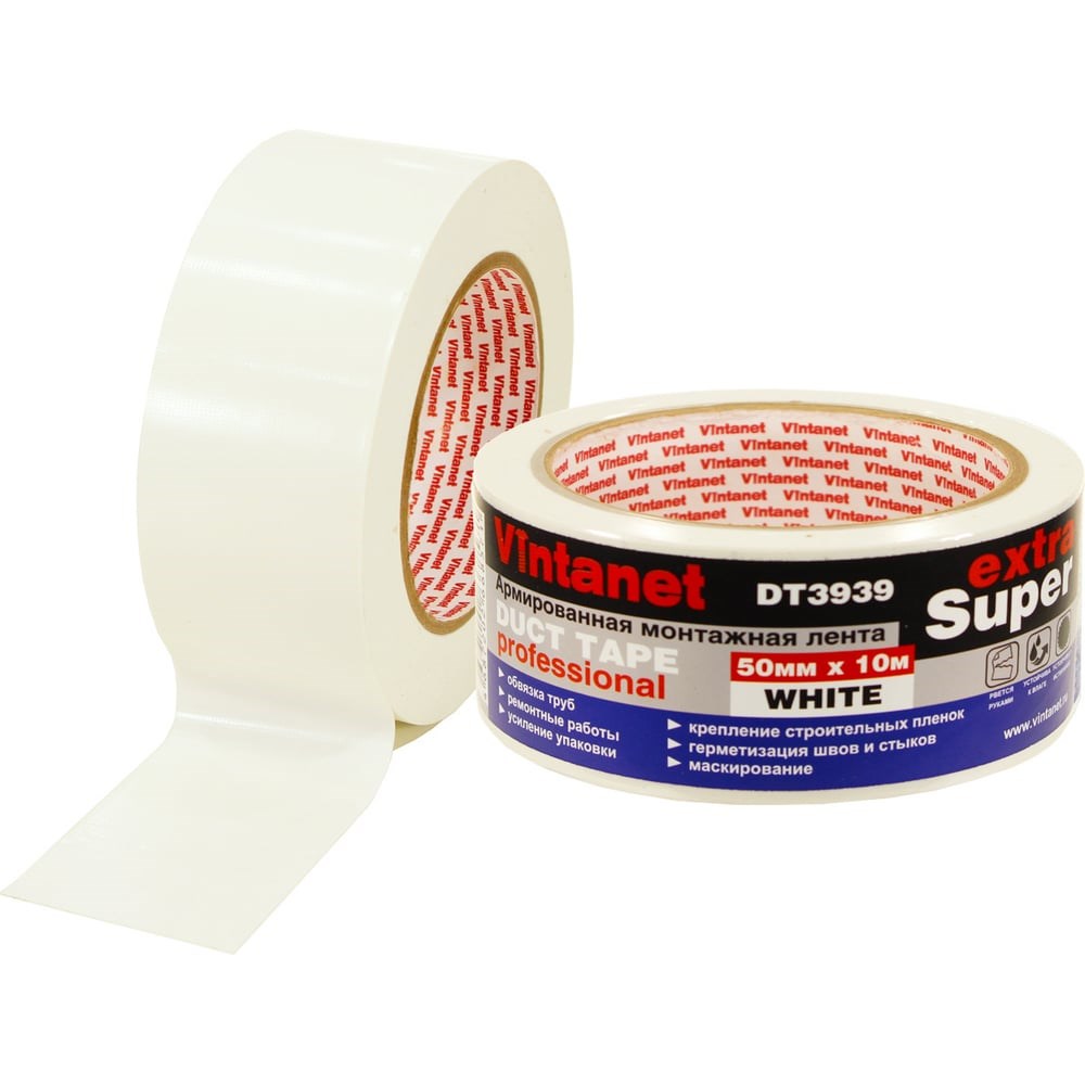Монтажная армированная лента Vintanet DT3939 ЭКСТРА СУПЕР, белая, 50 мм х 10 м DT39395010W - тканевая лента с полиэтиленовым покрытием. Клеевое покрытие - синтетический каучук. Устойчива к истиранию и к влаге. Легко рвется руками. Применяется в ремонтных работах, для обвязки труб, крепления ковров, герметизации швов и стыков воздуховодов систем кондиционирования, маскирования, крепления строительных пленок, крепления упаковки.