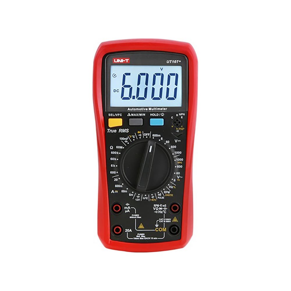 UT107+ представляет собой обновленный TRUE RMS мультиметр, разработанный для снятия электрических и автомобильных параметров. Модель обладает увеличенным до 6000 разрядов дисплеем, новым дизайном корпуса и платы, измерением постоянного и переменного тока. С его помощью можно измерять число оборотов коленчатого вала, угол замкнутого состояния контактов прерывателя трамблера, емкость, ширину импульса, а также проверить аккумуляторную батарею 12 В. В устройстве предусмотрена прозвонка межсоединений со звуковым сигналом, подсветка дисплея и диодный тест. Прибор имеет режимы относительных, максимальных и минимальных измерений и оснащен функцией сохранения показаний DATA HOLD. При перегрузке по напряжению и току, отрицательной полярности или разряде батареи срабатывает индикация.