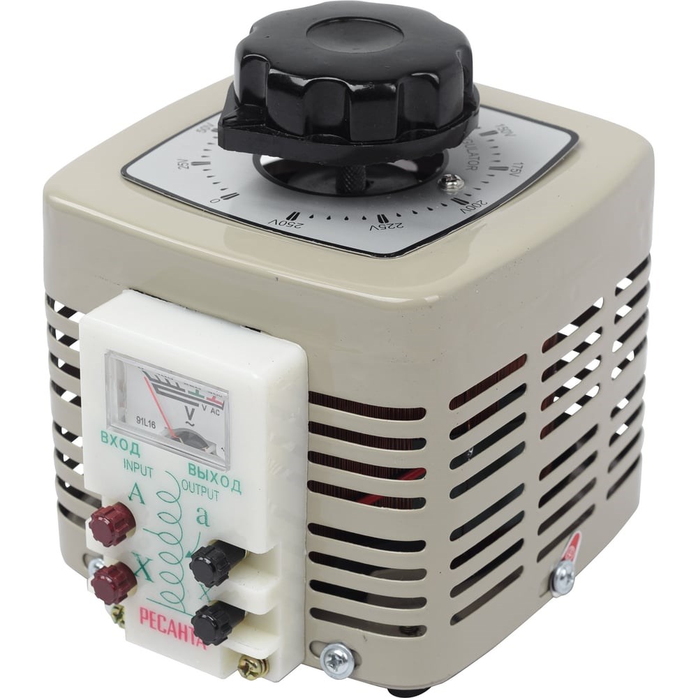 Ресанта ТР/0,5 (TDGC 2-0,5) – самый компактный в линейке трансформатор с плавной регулировкой напряжения и с естественным и принудительным охлаждением. Он может применяться как лабораторный автотрансформатор (ЛАТР), во время проведения диагностики и пусконаладочных работ электрооборудования, а также для ручного поддержания необходимого значения на нагрузке в случае отклонения сетевого напряжения в течение длительного времени. Диапазон регулирования составляет от 0-250В. Максимальная сила потребляемого тока – 2А. Мощность – 0.5 кВт.Лабораторный автотрансформатор выполнен в корпусе из металла с прорезями по всей поверхности, обеспечивающими вентиляцию. Корпус негерметизированный. Класс влаго- и пылезащиты – IP20. Ручка регулировки напряжения с градуированной шкалой в модели Ресанта ТР/0,5 (TDGC 2-0,5) расположена сверху. Для контроля напряжения предусмотрен стрелочный вольтметр. Автотрансформатор ЛАТР может работать в температурном диапазоне от 5°С до 40°С. Размеры прибора: 15х13.2х13.5 см. Вес – 3.36кг.