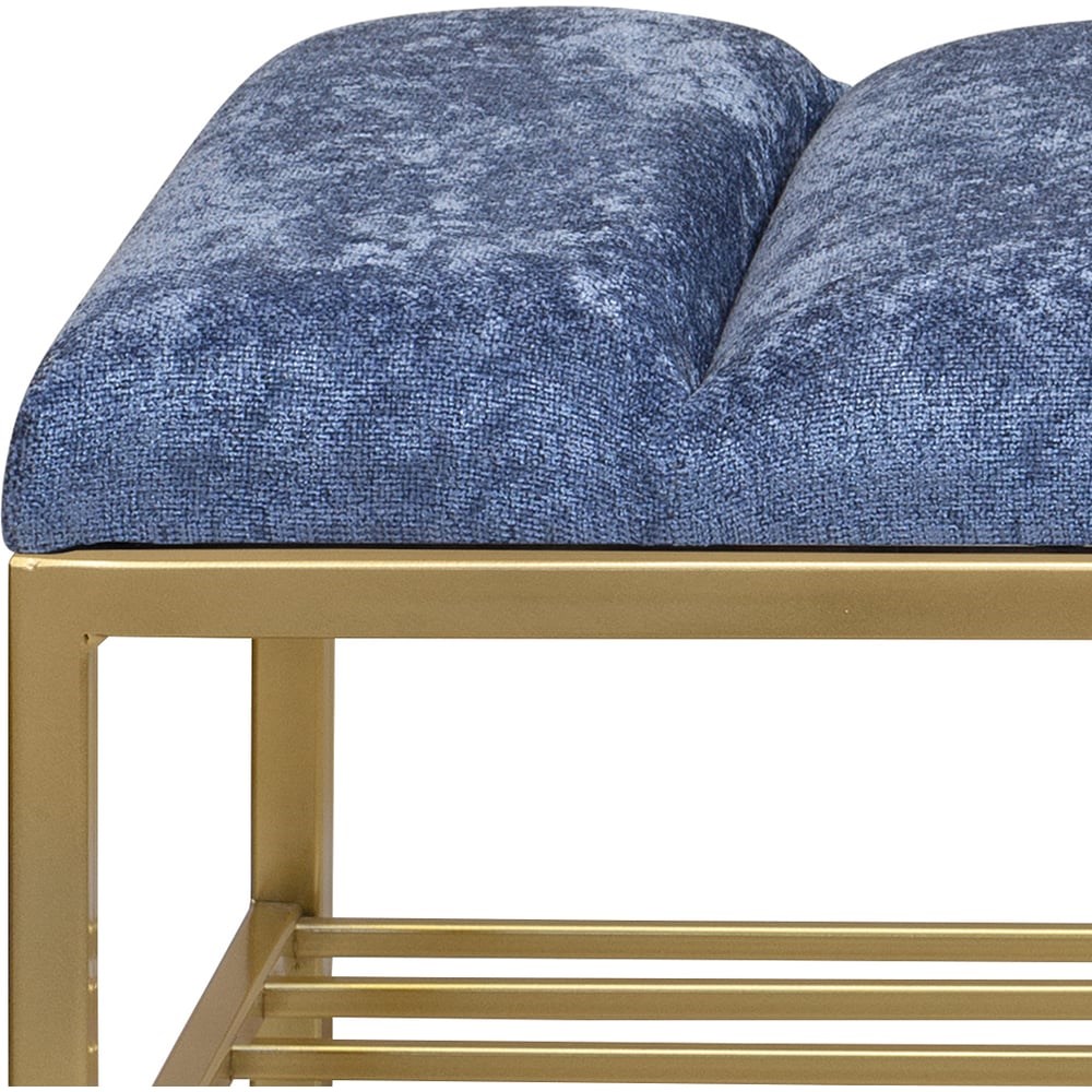 Банкетка RUBY с золотым основанием, полкой для обуви и мягким сиденьем в стяжке Bulon. Размеры банкетки: 1100 х 400 х 450 мм. Стальной каркас изготовлен из профильной трубы 20х20. Стильная банкетка-пуф без спинки с мягким сидением подойдет для прихожей, спальни, гостиной, кухни и кабинета. Отлично будет смотреться в качестве прикроватной банкетки для дома. Можно разместить в офисе, зале, салоне, фотостудии, гостинице, баре, клубе, кафе и ресторане. Доставляем банкетку в собранном виде в надежной упаковке.