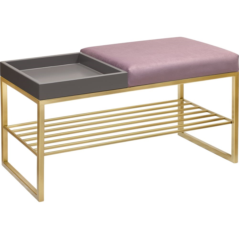 Банкетка предназначена для установки дома или в офисе.Выдерживает большую нагрузку и отличается прочностью.Покрытие устойчиво к износу и прослужит длительное время.Компактный размер модели подходит для любого пространства.Банкетка RUBY BOX с золотым основанием, мягким сиденьем, ящиком для аксессуаров и полкой для обуви. Размеры: 850 х 400 х 450 мм. Стальной каркас изготовлен из профильной трубы 20х20 мм. Открытый ящик выполнен из МДФ, покрыт цветной эмалью, мягкое сиденье - из искусственного велюра. Банкетка с полкой для обуви подойдет для прихожей и входной зоны. Удобно использовать в качестве прикроватной банкетки в спальне. Банкетку-скамью можно разместить в офисе, зале, салоне, фотостудии, гостинице, баре, клубе, кафе и ресторане. Доставляем банкетку в собранном виде в надежной упаковке.