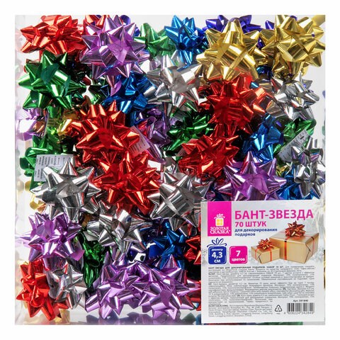 Набор состоит из 70-ти бантов-звезд в семи цветах с эффектом металлик - серебристый, золотистый, красный, зеленый, синий, розовый, фиолетовый. Банты выполнены из прочного полипропилена (70%), полиэтилена (15%) и полиэтилентерефталата (15%). Диаметр банта - 4,3 см.