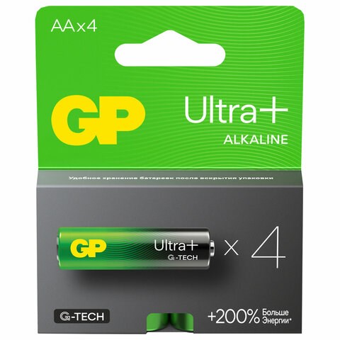 Батарейки КОМПЛЕКТ 4 шт., GP Ultra Plus G-Tech, AA (LR6), алкалиновые, пальчиковые, 15AUPA21-2CRSB4