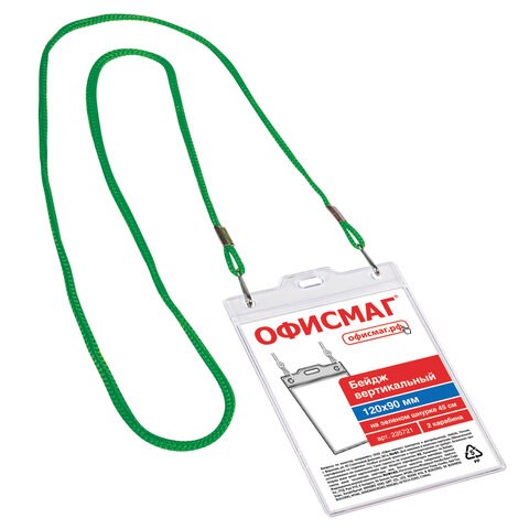 Бейдж вертикальный БОЛЬШОЙ (120х90 мм), на зеленом шнурке 45 см, 2 карабина, ОФИСМАГ, 235721