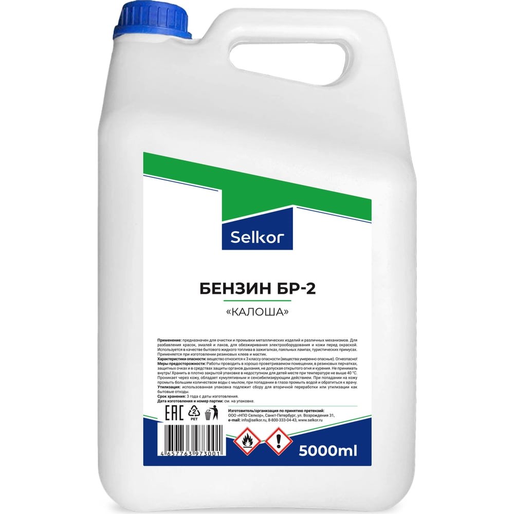 Бензин бр-2 Selkor"калоша" 5 л 43264 предназначен для очистки и промывки металлических изделий и различных механизмов, для разбавления красок, эмалей и лаков, для обезжиривания электрооборудования, кожи перед окраской. Используется в качестве бытового жидкого топлива в зажигалках, паяльных лампах, туристических примусах. Применяется при изготовлении резиновых клеев и мастик.