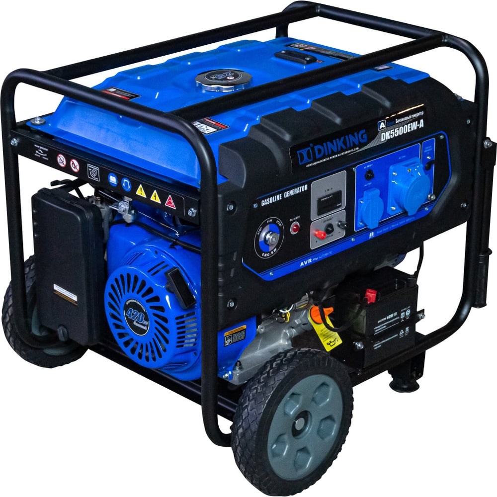 Бензиновый генератор Dinking DKA5500EW (5,5кВт, электростартер, 15лс, колёса) ГЕН014 применяется в качестве аварийного или автономного источника электроэнергии для питания бытовых электроприборов, электроинструмента, небольших станков, сварочных аппаратов. Оснащен двигателем с верхним расположением клапанов [OHV], что значительно увеличивает ресурс, снижает выхлоп и уровень шума. Датчик контроля масла исключает запуск и работу генератора при отсутствии или низком уровне масла в картере.