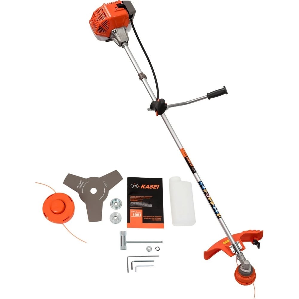 Бензиновый триммер Ex Kasei CG415Q33AB представляет собой устройство, предназначенное для эффективного ухода за газонами и участками с густой растительностью. Оснащенный двухтактным двигателем с верхним расположением, он обеспечивает мощность в 0.900 кВт (1.250 л.с.) и объем двигателя 33 см³, что позволяет справляться с различными задачами по скашиванию. Прямой приводной вал и U-образная велосипедная ручка обеспечивают удобство в управлении и маневренность. Триммер поддерживает использование как лески, так и ножа, что делает его универсальным инструментом для различных типов растительности. Ручной стартер и полуавтоматическая подача лески упрощают эксплуатацию, а емкость бака в 1.250 литра позволяет работать продолжительное время без дозаправки.