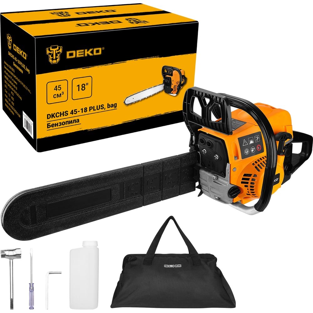 Бензопила DEKO DKCHS 45-18 PLUS, 3,1 л.с., 45 куб.см, 18", в сумке - мощный и надежный инструмент для распила древесины, подойдет для ухода за деревьями на участке, а также для заготовки дров. Защитный щиток является одновременно защитой для рук оператора и тормозом цепи, что не позволяет нанести травмы при соскальзывании и обрыве оснастки. Эргономичная задняя рукоять обеспечивает крепкий хват и надежное удержание инструмента.
