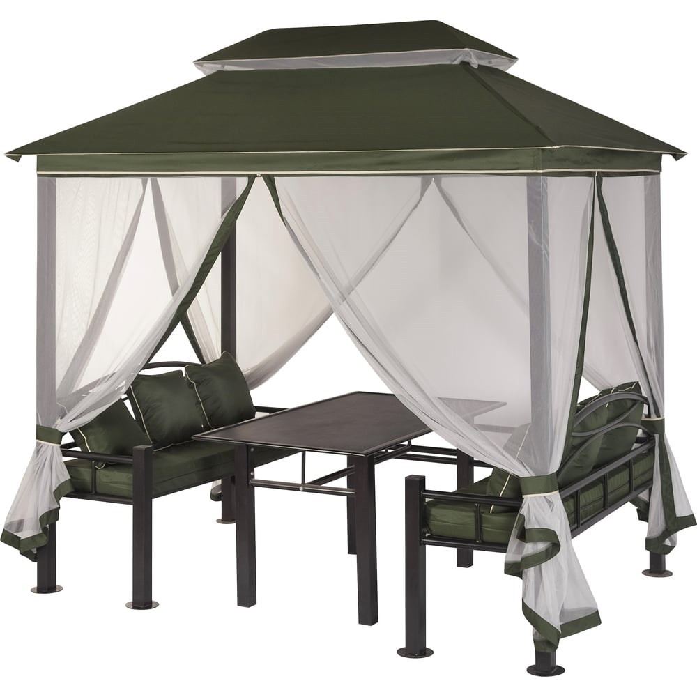 Беседка Удачная Мебель Уют, зеленая A32A.T01 предназначена для размещения на открытом участке. Имеет две встроенные скамьи и стол. Допустимая нагрузка на сиденье - 200 кг. Металлический каркас покрыт порошковой краской для стойкости к коррозии. Москитная сетка защищает от пыли и назойливых насекомых. Шатер легко собирается, не требуя серьезных трудозатрат. Широкая крыша тента из плотного материала имеет влагостойкую пропитку.