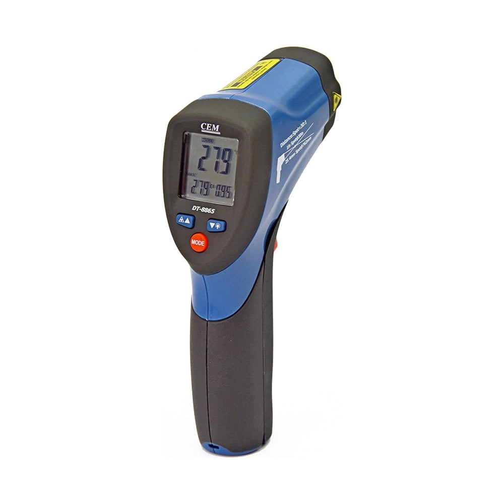 Пирометр СЕМ DT-8865 480823 для удобства в работе автоматически удерживает полученные показания на тройном подсвечиваемом ЖК-дисплее. Для экономии заряда батареи предусматривается автовыключение через 7 секунд бездействия прибора. Есть возможность заблокировать функцию автоотключения для работы в режиме мониторинга. Индикатор разряда батареи своевременно информирует оператора о необходимости замены источника питания. Коэффициент излучения поддается регулировке.