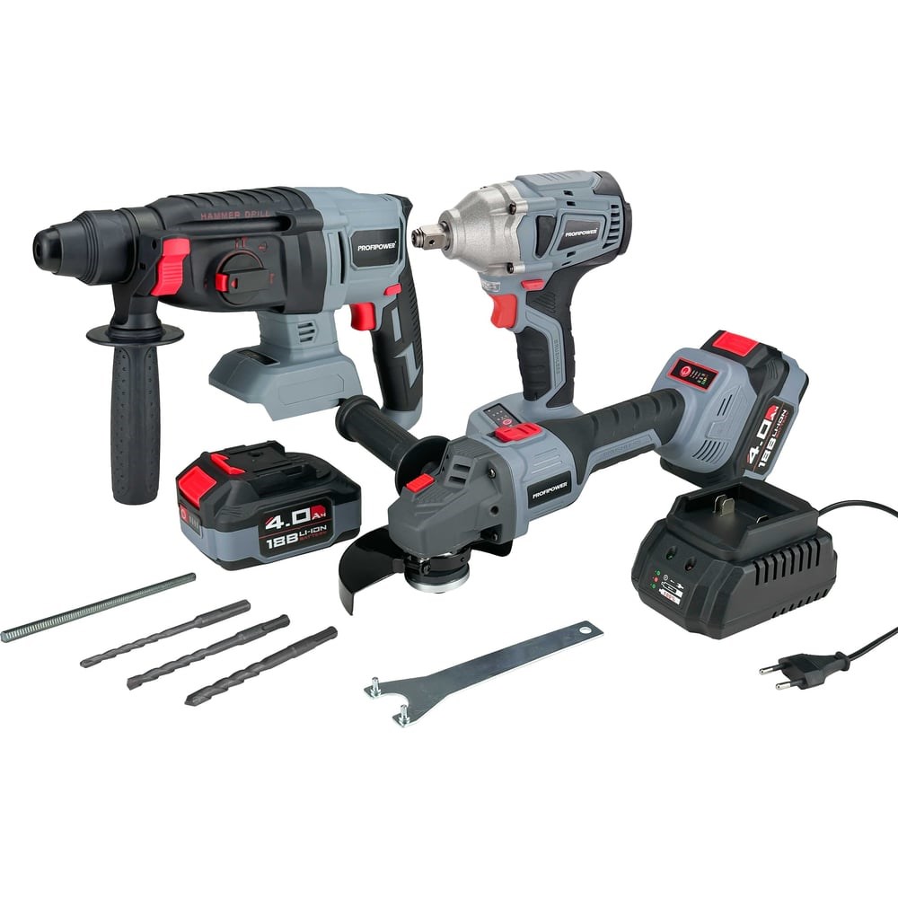 Аккумуляторный бесщеточный набор 3в1 Profipower УШМ MKDGA-18V, гайковерт MKDTW-18V, перфоратор MKDHR-18V (Li-ion-2шт 18В, 4.0Ач, З/У) E0095