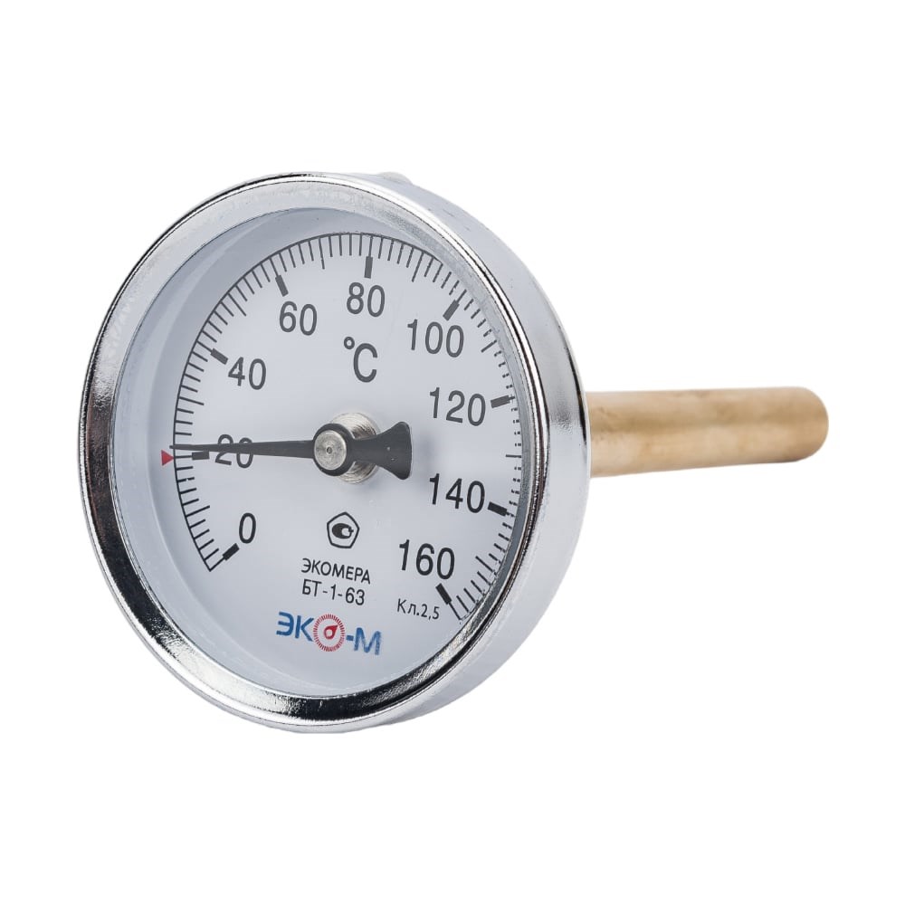 Биметаллический термометр ЭКО-М ЭКОМЕРА БТ-1-63, 0-160C, L=100 БТ-1-63-160С-L100 предназначен для измерения температур в системах кондиционирования, теплоснабжения, водоснабжения и универсального пользования.