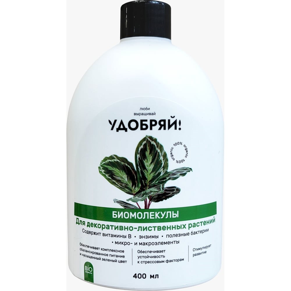Биомолекулы «Удобряй» -уникальный комплекс микроорганизмов и продуктов их жизнедеятельности, обеспечивающий максимальную биодоступность элементов питания для растений. Формулы биомолекул разрабатывались несколько лет, и только сейчас, благодаря новым научным разработкам и современному оборудованию удалось воплотить их в жизнь и создать уникальный препарат для органического земледелия. Это рецептуры нового поколения, которые повышают биодоступность питательных веществ в разы, благодаря фосфор- и калиймобилизующим микроорганизмам, начинающим работать в почве уже при +5˚СБиомолекулы Удобряй для балконных и комнатных цветов обеспечивают интенсивную и яркую окраску листьев. Улучшают декоративный вид. Стимулируют прирост новых побегов и улучшает рост растений. Обеспечивают устойчивость к стрессовым факторам. 100% биологический продукт, безопасно для сада, дома, пчел и подземных вод.Состав: Растительные экстракты, органические кислоты, макро- и микроэлементы в легкодоступной хелатной форме ( N–5,0; P2O5–4,5; K2O–4,0; Fe–0,7; Mg - 0,6, В -0,1, Mn–0,1; Zn–0,05; Cu–0,01; Mo– 0,01; S-1,3); комплекс 18 аминокислот, витаминов группы В, в том числе: В1 - 0,1; В6 - 0,1 ; В12 - 0,1, Энзимы, Бактерии Bacillus megaterium var. Phosphaticum, Bacillus subtilis.Норма расхода:Внекорневая подкормка - 15мл/1,5-2л воды с интервалом 14-20 дней.Корневая подкормка - 15-20мл/1-1,5л воды с интервалом 14-20 дней.