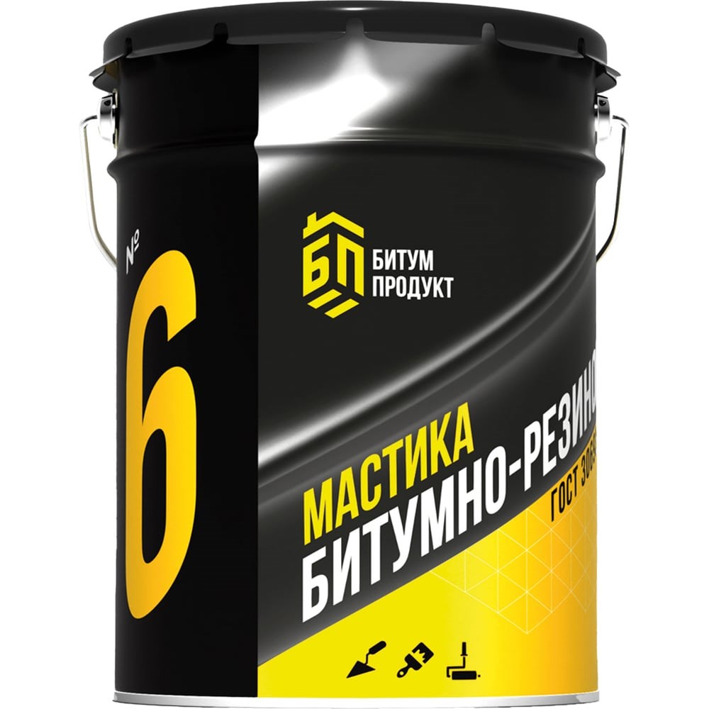 Битумно-резиновая мастика БИТУМ ПРОДУКТ 20 кг BP-6 - готова к нанесению и включает в себя все необходимые технологические добавки, наполнители и растворители. Служит отличным решением для обустройства и ремонта кровель, укладки самоклеящихся и иных гидроизоляционных материалов. ГОСТ 30693-2000 Предназначена для приклеивания самоклеящийся рулонных материалов к бетонному или металлическому основанию, подходит для ремонта мастичной кровли, а также гидроизоляции бетонных конструкций. Применяется по сухой, очищенной от грязи поверхности. Тщательно перемешать до начала проведения работ. Диапазон температур применения от -20°С до +40°С. При температуре ниже +5°С выдерживать в теплом помещении не менее 24 часов. Время высыхания мастики при стандартных условиях не более 24 ч. Перед применением рекомендуется обработать поверхность праймером. Не применять вблизи источников открытого огня. Работы проводить в хорошо проветриваемых помещениях. Избегать попадания на кожу и в глаза.