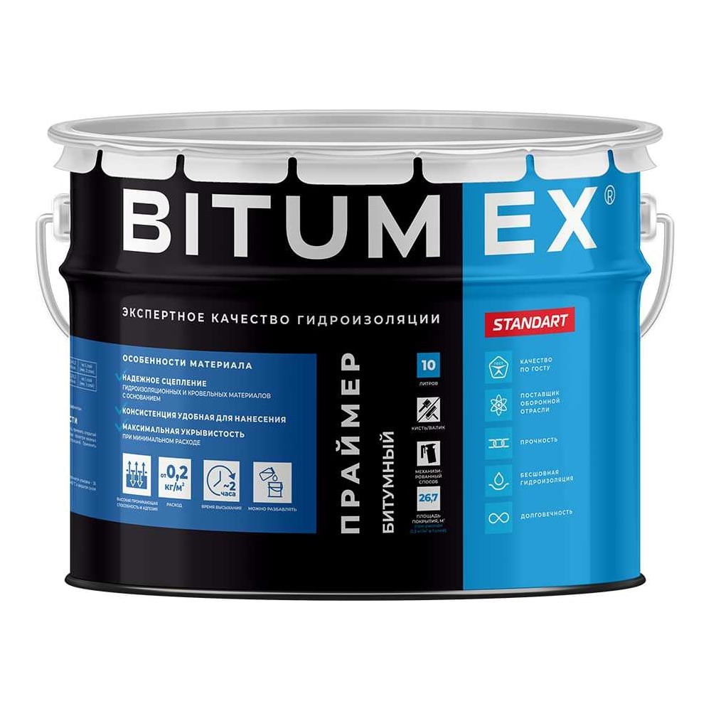 BITUMEX Праймер битумный (ведро 10л) ПБ-035 предназначен: для подготовки поверхности (грунтования, обеспыливания и пропитки) изолируемого основанияиз дерева, цементно-песчаной стяжки (ЦПС), бетона, кирпича, металла перед нанесением основного слоя гидроизоляциирулонных битумных материалов, битумной черепицы и битумных мастик. для гидроизоляция фундамента, пола гаража, подвала (в нежилых помещениях). Это готовый к применению материал на основе композиций растворителей, нефтяных битумов и модификаторов.Используется в холодном состоянии. Состав компонентов праймера позволяет проникать в поры и открытые поверхностные трещины основания, легко смачивает поверхность различающихся по плотности материалов и связывает присутствующие на изолируемой поверхности частицы. Расход на грунтование бетона М300, асбоцементного листа (шифер), металла: 0,2-0,3 кг/м2 на 1 слой (1 слой); ЦПС М50, дерева, кирпича: 0,4-0,5 кг/м2 на 1 слой (2 слоя). Нанесение Перед применением тщательно перемешать. При работе при t ниже +5 С, материал следует выдержать в теплом помещении в течение суток при комнатной температуре. Обрабатываемая поверхность должна быть сухой, предварительно очищенной от грязи, пыли, непрочных остатков старого покрытия, ржавчины, снега, наледи. Влажные поверхности необходимо просушить. Допустимая влажность основания не должна превышать 4% по массе. Работы рекомендуется выполнять при температуре окружающей среды от -10 до +40 С. Праймер наносится при помощи кисти или малярного валика в 1-2 слоя.