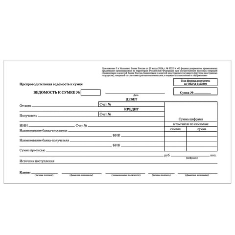 Бумага офсетная плотностью 60 г/м2. Внутренний блок проклеен по одному краю. Бланк предназначен для препровождения денежных средств. Формат А5 (135х195 мм). Поставляется в виде книжки в количестве 100 штук в термоусадочной пленке. Соответствует государственным стандартам документального ведения учета.
