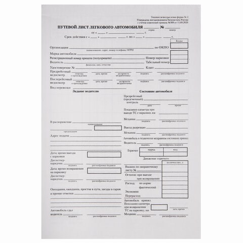 Вид бланкаПутевой лист легкового автомобиля