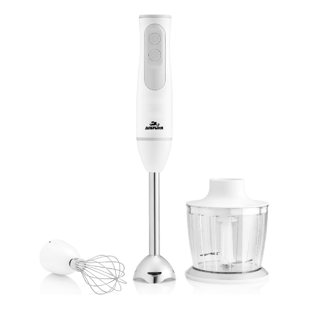Технические характеристики: Тип: блендерный набор 2 скорости Комплектация: Блендер; венчик, чаша измельчитель Объем 600 мл Мощность: 1000 Вт Материал корпуса: пластик Материал погружной части: металл Ножи: нержавеющая сталь Мотор: DC (постоянный ток) Напряжение: 220-240 V, 50 Гц