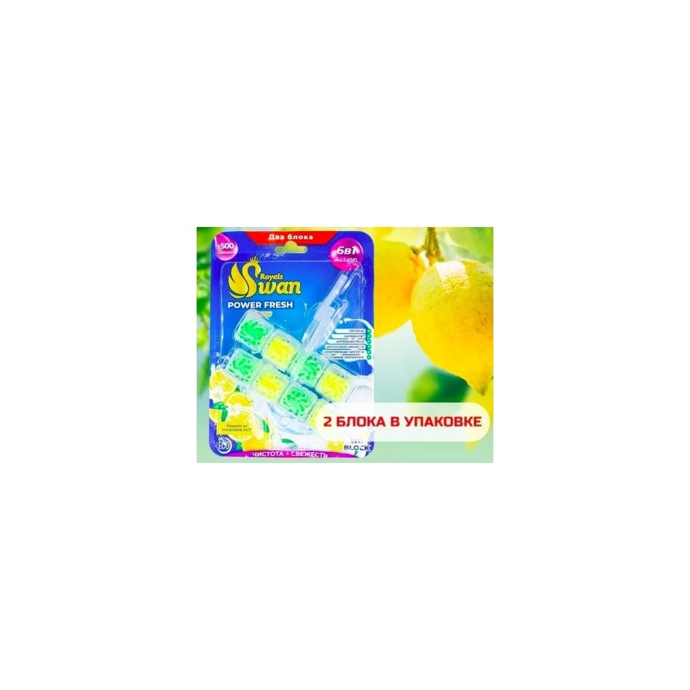 Блок для унитаза Royals Swan 2x40 гр, Лимон RSWBD09 помогает обеспечить блокировку неприятных запахов 24/7, защиту от загрязнений и микробов и сохранить чистоту и блеск. При каждом смывании появляется изысканный аромат цветочного сада на срок 24 часа и обильная пена, которая борется с налетом, поддерживая гигиену и блеск поверхности унитаза. Блок Royals Swan для унитаза содержит активное вещество, которое под действием напора воды ополаскивает всю поверхность унитаза, защищая от бактерий и помогая предотвращать известковый налет. Как установить туалетный блок? Вскройте пластиковую упаковку, достаньте блок и поместите под ободок унитаза в место наиболее сильного потока воды при смыве с помощью держателя. По окончании использования ароматического блока выбросите его в мусорное ведро. Состав: <30% анионных пав, солей неорганических, 5-15% неионогенных ПАВ, <5% цитрата натрия, растворителя отдушки (эссенция).