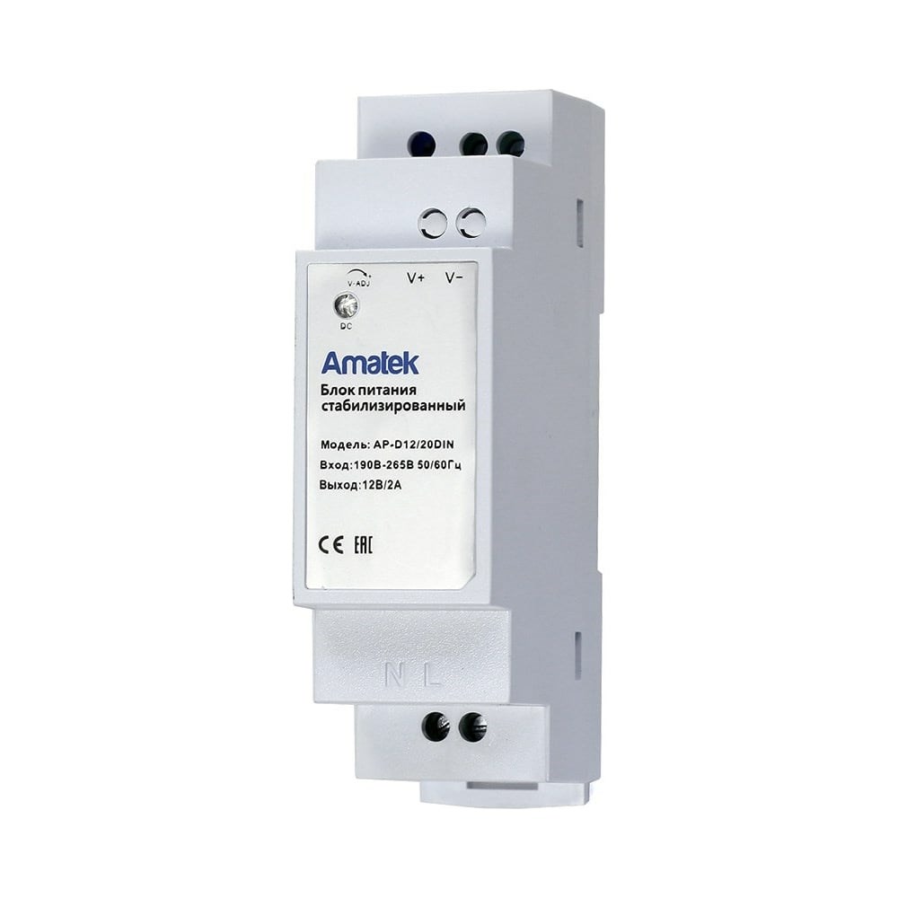 Блок питания Amatek AP-D12/20DIN 12В / 2А стабилизированный 7000704 предназначен для обеспечения потребителей бесперебойным электропитанием с номинальным стабилизированным напряжением 12В постоянного тока и током потребления до 2А. Электропитание от сети переменного тока 50 Гц напряжением от 190 В до 265В. Источник питания устанавливается на DIN-рейку. Блок питания предназначен для установки в помещении и рассчитан на круглосуточный режим работы. Отличительные особенности Amatek AP-D12/20DIN: Выход: = 12В, ток 2А, 24Вт Регулировка выходного напряжения 12-14В Вход: ~190-265В, 50Гц, до 1,4А Защита от перегрузки по выходу 2,4А Защита от повышения напряжения по выходу 16В Автоматическое восстановление выходного напряжения после снятия перенапряжения или перегрузки; Пульсация напряжения на выходе не более 100 мВp-p Эффективность (КПД) 88% Пластмассовый корпус 27×92×56 мм с возможностью монтажа на DIN-рейку; Эксплуатация: от -20°С до +50°С, влажность 10 - 90% RH.
