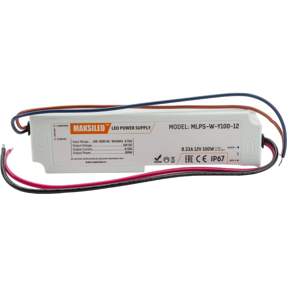 Блок питания MAKSILED 12В, 100Вт, IP67, 8,3А, пластик, 190х52х37мм MLPS-W-Y100-12 отличается высокой надежностью и компактными размерами. Он незаменим для питания светодиодных осветительных приборов и других устройств. Блок питания имеет защиту от короткого замыкания, перегрузки, перегрева. Автоматический перезапуск при восстановлении нормальных условий. Для обеспечения долгосрочной и стабильной работы б/п рекомендуем при выборе устройства предусматривать запас по мощности примерно в 20%.