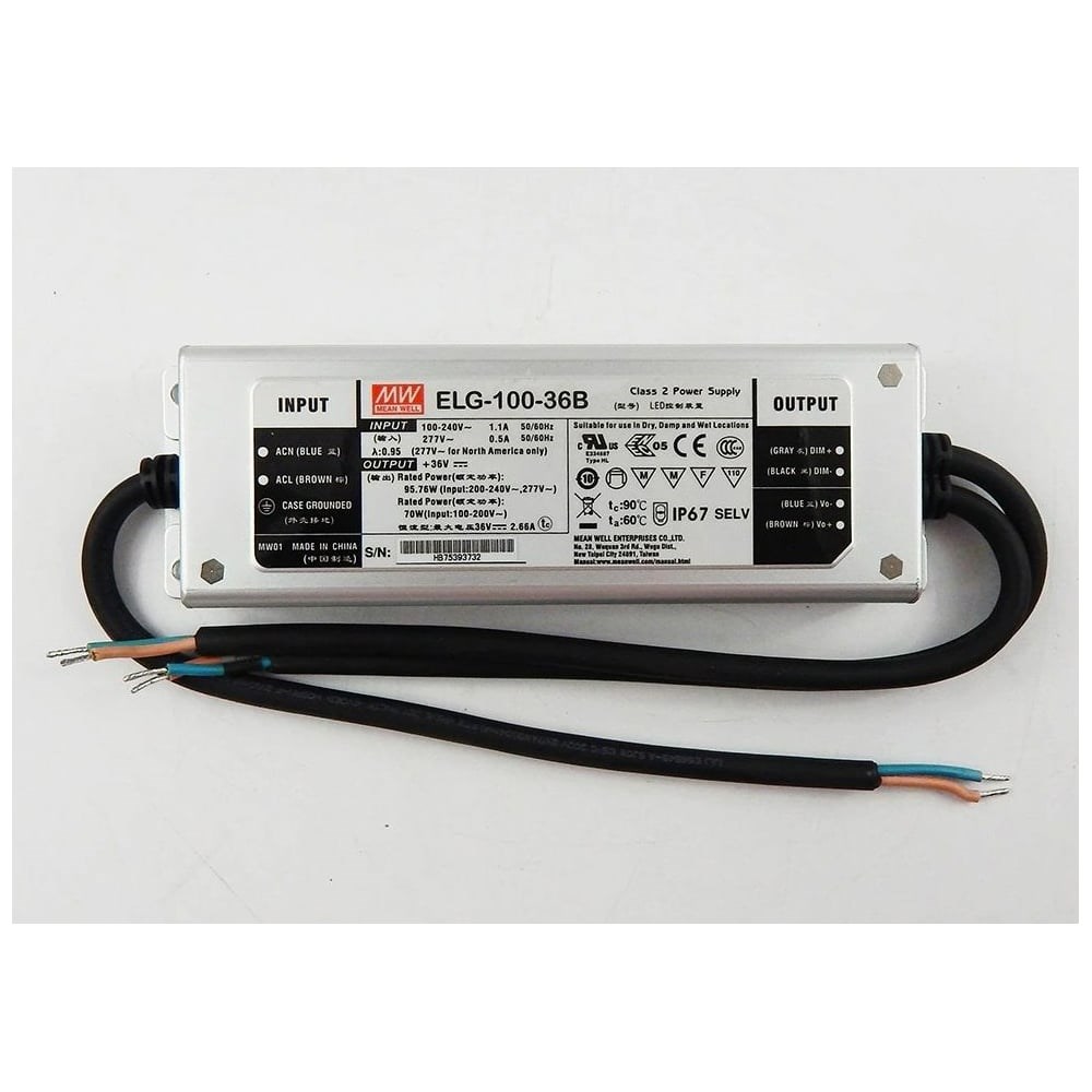 Блок питания Mean Well ELG-100-36B-3Y AC-DC, 95,8 Вт Т02600708 используется для преобразования переменного напряжения питающей сети в постоянное напряжение. Тип: AC-DC Мощность: 95,8 Вт Класс зашиты: IP67 Вход: 100-305 В AC Вход: 142-431 В DC Корректор коэффициента мощности Выход: 18-36 В/2,66 А Изоляция 3750В AC В кожухе 199х63х35,5 мм Температура эксплуатации: -40…+70°С Димминг 3 в 1 С проводом заземления