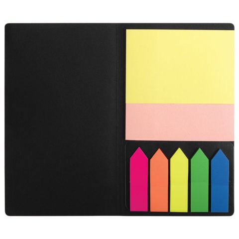 Набор из 2 стикеров пастельного цвета в форме прямоугольников 51х75 и 25х75 мм по 20 листов каждый и 5 закладок неоновых цветов в форме стрелок размером 12х48 мм, каждая по 20 закладок. Плотность бумаги составляет 75 г/м2. Клейкий слой - 35 Н/м. Легко клеятся к любой поверхности. Не оставляют следов. Листы уложены в картонную книжку и упакованы в полиэтиленовый пакет с европодвесом.