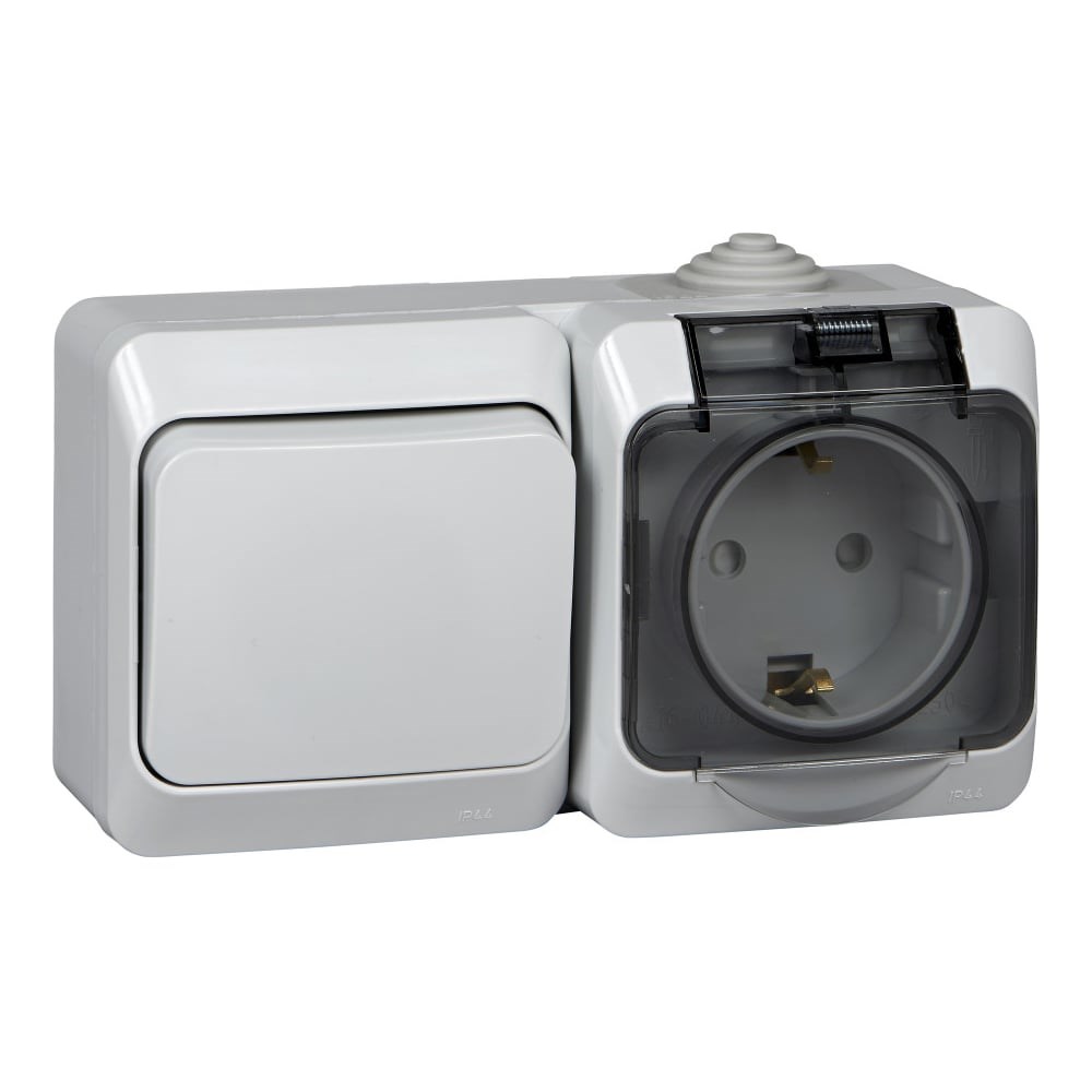 Блок Systeme Electric (ранее Schneider Electric) ЭТЮД (серый, открытой установки).предназначен для применения в сетях до 250Всостоит из розетки на 16А со шторками и без заземления и одноклавишного выключателя на 10Аудобен в применении и отлично подходит для ванной комнаты (IP44)сделано в России
