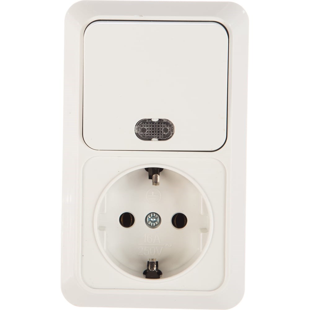 Вертикальный блок: одноклавишный выключатель c подсветкой + розетка с заземлением, белый UNIVersal Олимп О0039 широко используется как в жилых домах, так и в офисах, на складах, в подсобных помещениях и пр. Корпус изделия изготовлен из высококачественного пластика. Лицевая панель имеет классический белый цвет. Размер: 122х68х43 мм.