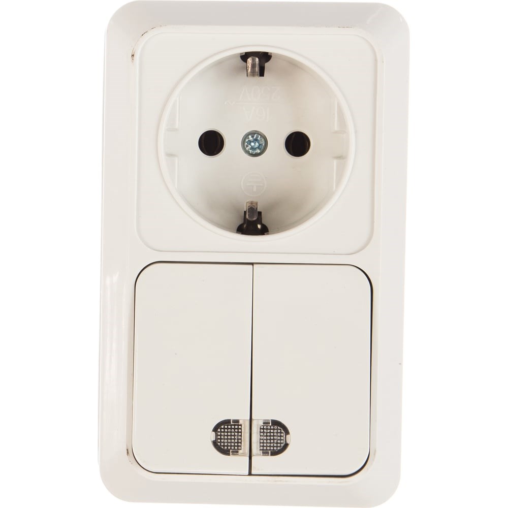 Вертикальный блок: двухклавишный выключатель c подсветкой + розетка с заземлением, белый UNIVersal Олимп О0041 - электротехническое устройство 2 в 1. Служит для подключения бытовых электроприборов к сети переменного тока. Благодаря индикаторной подсветке на клавишах блок легко идентифицировать в темном помещении для включения освещения. Размер: 122х68х43 мм.