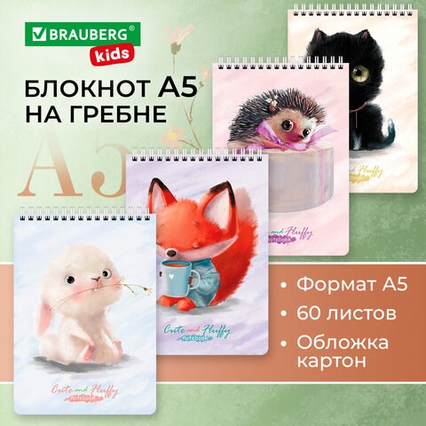 Блокнот А5 (146х206 мм), 60 л., гребень, картон, клетка, BRAUBERG KIDS, "Милые зверята", 114364