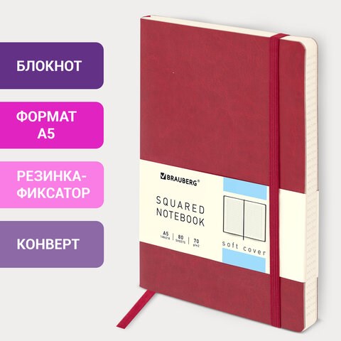Блокнот А5 (148x218 мм), BRAUBERG "Metropolis Ultra", под кожу, 80 л., резинка, клетка, красный, 111018