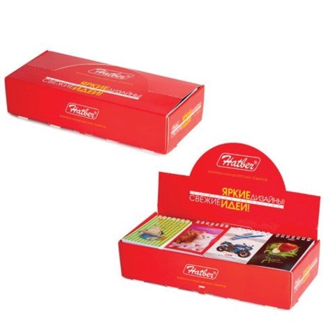 Комплект блокнотов А7 формата. Количество листов в блокноте: 40. Обложка: мелованный картон. Внутренний блок: офсет 60 г/м2, клетка. Скрепление: гребень. Упаковка: ассорти 8 видов в индивидуальном картонном дисплее. Яркий настольный дисплей изготовлен из плотного картона, благодаря чему конструкция устойчива и привлекательна. Внутри имеются картонные перегородки для создания ячеек под хранение блокнотов. Каждый дисплей индивидуально упакован в термоусадочную пленку.