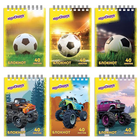 Блокнот МАЛЫЙ ФОРМАТ А7 75х105 мм, 40 л., гребень, картон, клетка, ЮНЛАНДИЯ, "Монстр-трак" / "Футбол", 129859