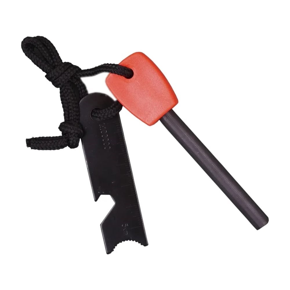 Материал ручки: пластик В торце предусмотрено кольцо для подвешивания на шнур Состав: кресало, линейка с разметкой на 5 см, гаечный ключ 7-8 мм Диаметр стержня: 8 мм Рабочая длина стержня: 70 мм Общая длина: 11 (+/- 5) мм Способ поджига: Кремневая
