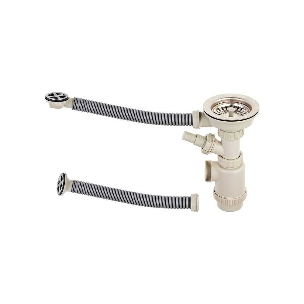 Конструкция водосливной арматуры состоит из герметично соединенных между собой патрубков и предназначена для выведения использованной воды через сливное отверстие в канализацию, исключая риск затопления, а также, обеспечивает защиту от вредоносных канализационных запахов и препятствует их распространению в помещении. Размер выпускного отверстия 3 1/2" соответствует современному стандарту отверстия для слива кухонной мойки по европейским нормам. Благодаря диаметру отверстия 90 мм вода спускается быстрее, а также слив реже засоряется при попадании остатков еды. Модель оснащена функцией перелива и укомплектована верхним и боковым круглыми переливами для гранитных и металлических моек. В конструкции предусмотрен штуцер для подключения стиральной или посудомоечной машины.