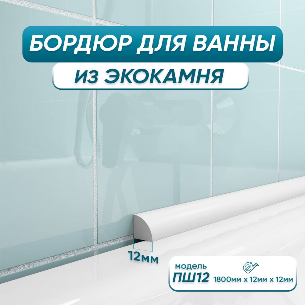 Лаконичное решение для перекрытия зазора между плиткой и ванной. Акриловый камень из которого сделаны бордюры - это твердый, цельный материал. Прост в монтаже и уходе, не меняет свой цвет и форму. Не допускает появления грибка и плесени. Ширины бордюра - 12 мм хватит, для того чтобы перекрыть зазор до 8 мм. Благодаря своим оптимальным размерам, он не только защитит от попадания воды в щели и предотвратит распространение плесени, но и хорошо скроет все мелкие недостатки. Для распила потребуется ножовка по металлу или торцовочная пила с диском по дереву или алюминию, монтаж производится на герметик или водостойкий клей. Для облицовки ванной бордюрами с 3-х сторон вам понадобится: Прямой бордюр 180 см Левый бордюр 75 см Правый бордюр 75 см Если левая и правая сторона ванны более 75 см, то рекомендуем взять прямой бордюр 90 см.