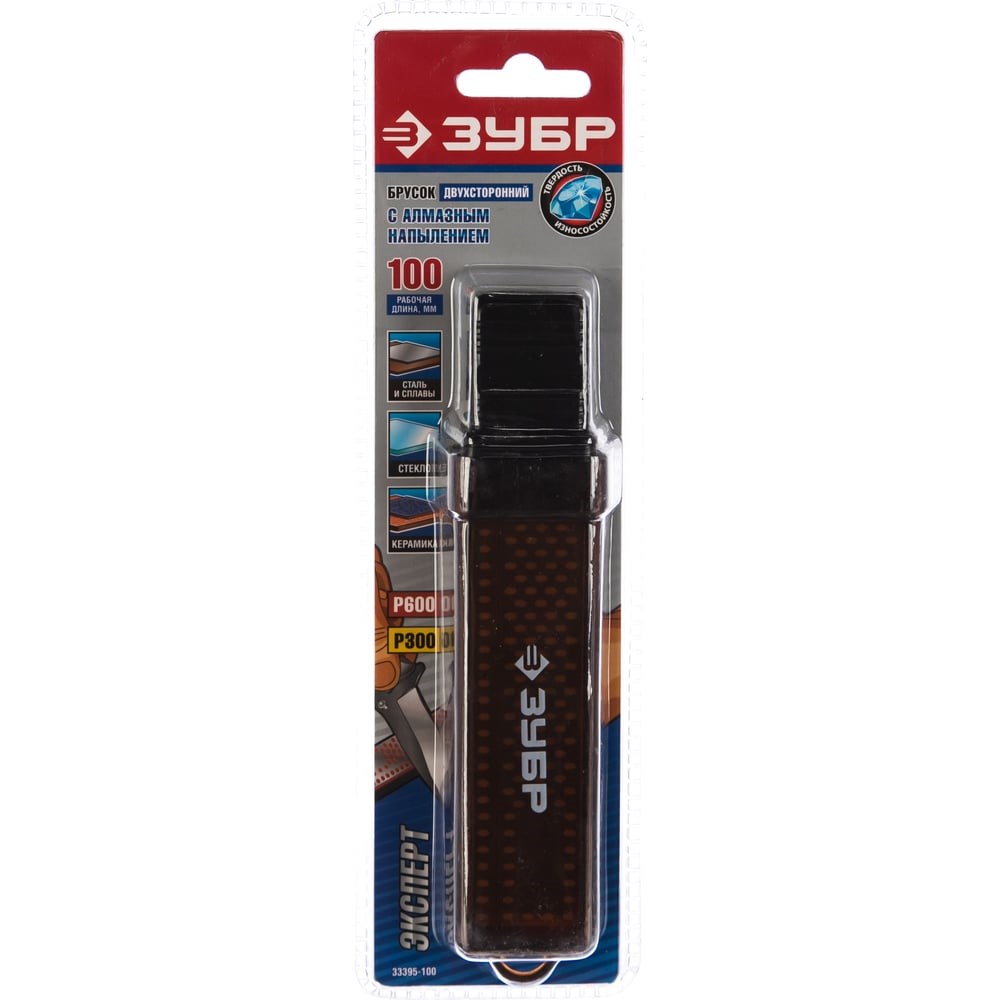 Брусок с алмазным напылением Зубр P 300/600, правочный двухсторонний, в пенале, 100 мм 33395-100 имеет алмазное нанесение из высококачественных синтетических алмазов разной зернистости, отличающиеся цветом. Поставляется с пластиковым пеналом. Брусок применяется для заточки и доводки ножей и лезвий режущих инструментов, обработки различных поверхностей и снятия острых кромок с твердых материалов. Длина полотна 10 см. Ширина полотна 2,5 см.