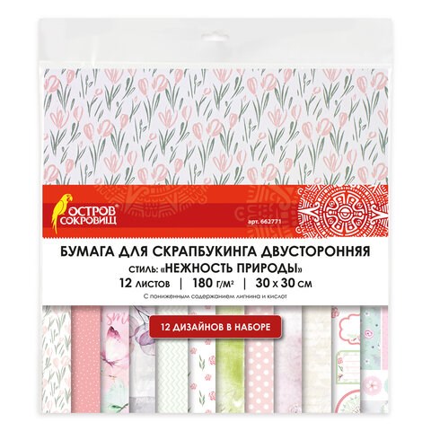 Бумага для скрапбукинга 30х30 см "Нежность природы", двусторонняя, 12 листов, 12 дизайнов, 180 г/м2, ОСТРОВ СОКРОВИЩ, 662771