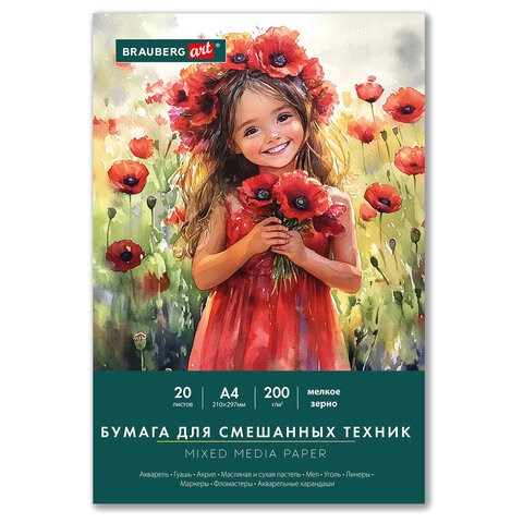Бумага для смешанных техник (акварель/карандаш/пастель) MixMedia, 200 г/м2, А4, 20 л. в папке, BRAUBERG ART CLASSIC, "Маки", 116963