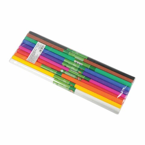 Плотность – 32 г/м2. Степень крепирования – 30-40%. Целлюлоза 100%. В наборе 10 рулонов традиционных цветов: красная, белая, оранжевая, желтая, зеленая, синяя, малиновая, фиолетовая, коричневая, черная. Бумага упакована в прозрачный пакет, размер упаковки – 505х175х45 мм.